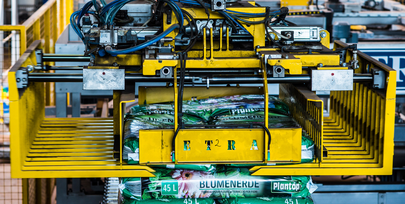 Con un totale di nove linee di impacchettamento del tutto automatizzate, vengono preparati circa 350 000 pallet europei all’anno contenenti terriccio, substrati e prodotti di corteccia pronti per la consegna.